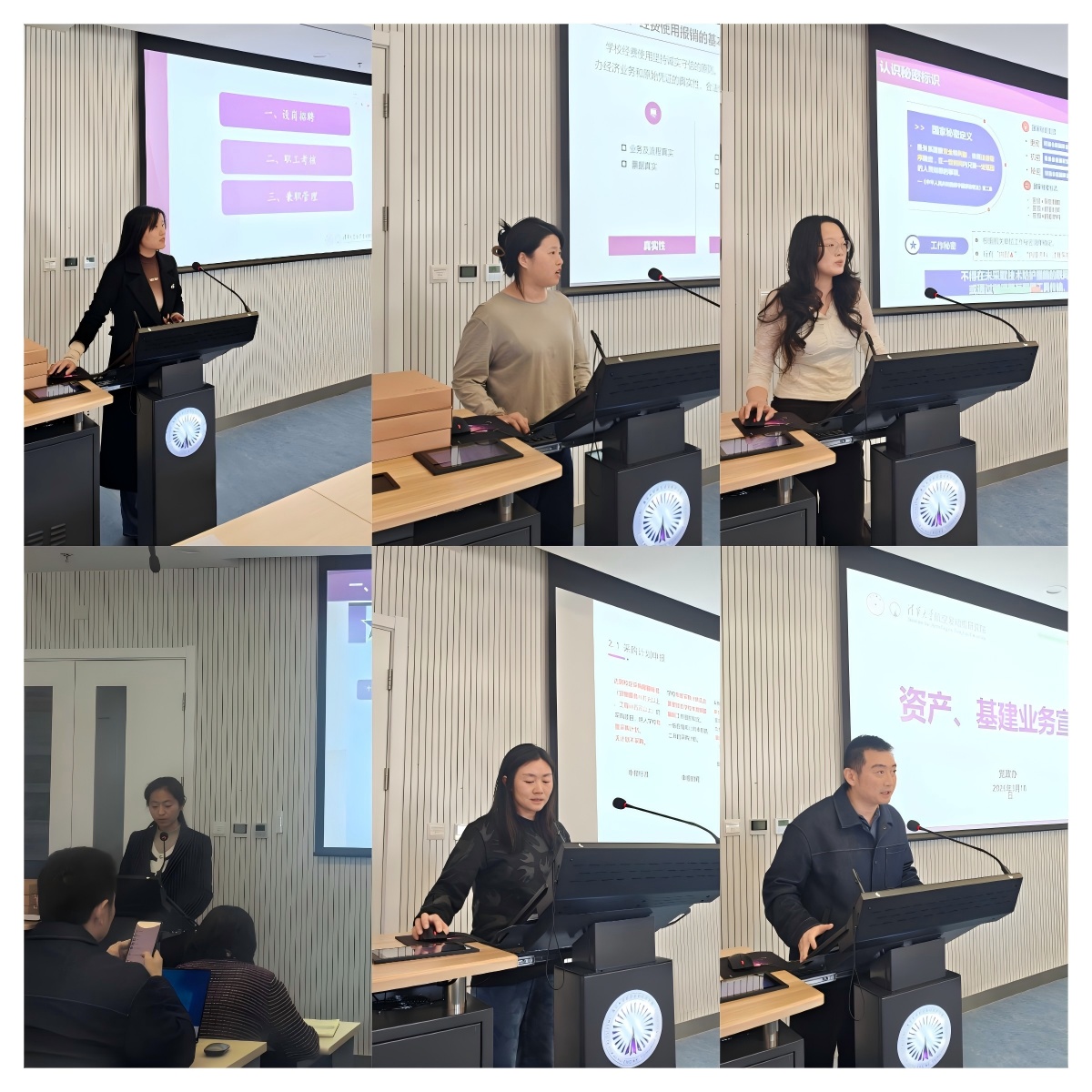 随后,行政业务宣讲会接续进行,内容覆盖人事、财务、宣传、资产基建、设备采购、保密及科研管理等重点领域。党政办刘红静解读项目制人员招聘入职、职工考核与兼职管理等人事工作要点;党政办王晓晓结合案例梳理报销付款流程,明确经费使用规范;党政办米雪传达学校宣传例会精神,介绍2026年度宣传工作思路,讲解年度重点宣传事项征集要求;党政办郑谦介绍固定资产建账及装修基建审批流程;测算中心姜赟详细讲解科研设备采购注意事项;科研办郑佩玄系统宣讲保密工作要求及科研管理流程。